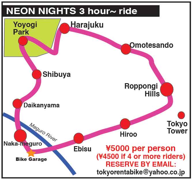 Ride Available if minimum of 2 riders are signed up! Email to: tokyorentabike@yahoo.co.jp for reservations at least 1 day in advance.
